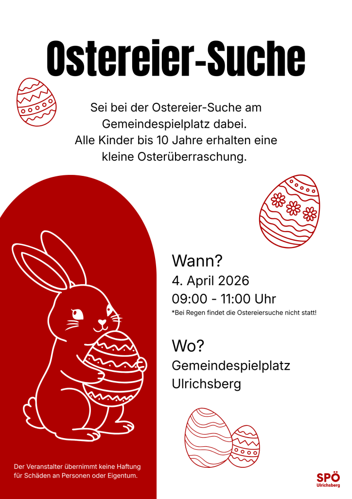 Wir laden euch herzlich zu unserer Ostereier-Suche ein! Schnappt euch eure Körbchen und helft uns, die versteckten Schätze im Gemeindespielplatz zu finden. Wer zwischendurch eine kleine Pause braucht, kann an unserer Malstation bunte Osterbilder gestalten.